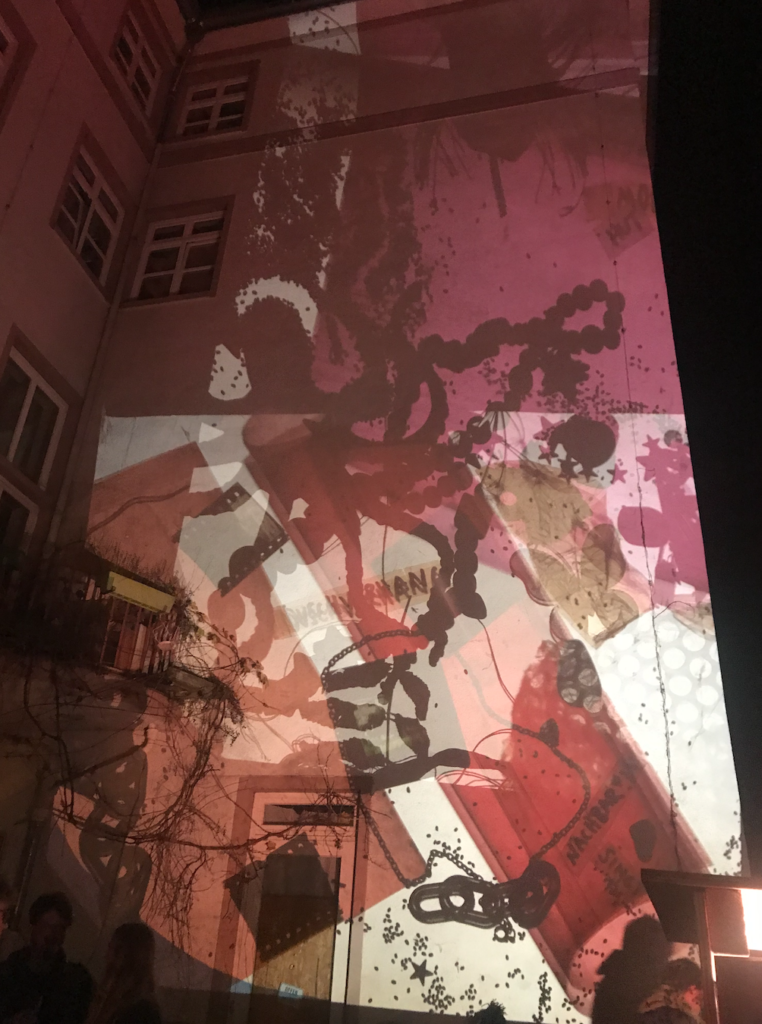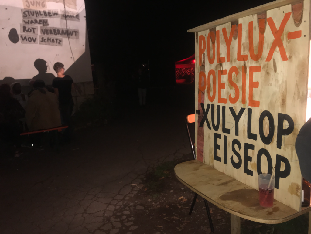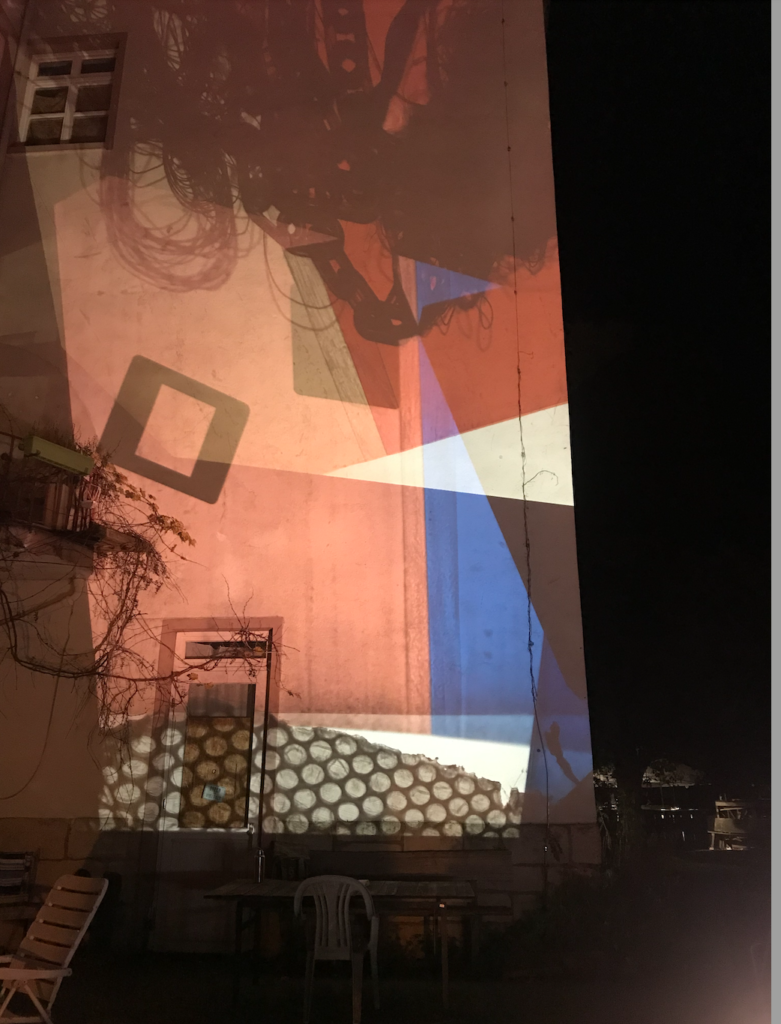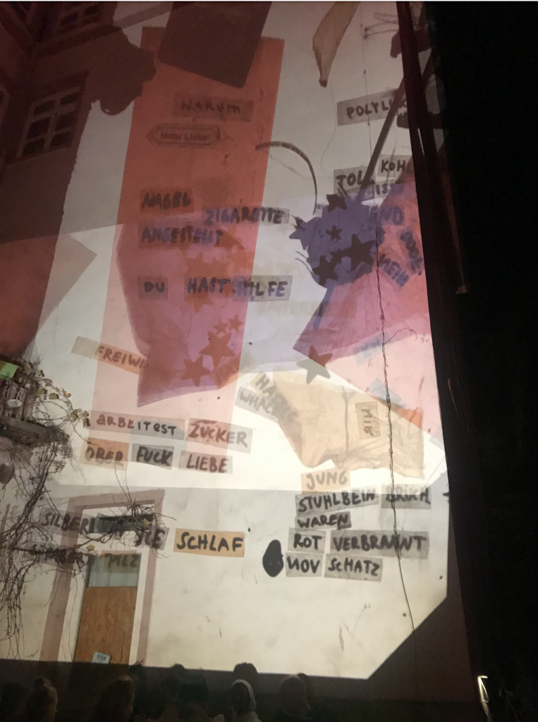 Polylux-Xulylop was developed in collaboration with Katja Rehor for fun, aesthetics and collective writing at „Folk and Fusion Festival“ Hildesheim. It consists of two projectors capable of lighting up a whole house facade, rain protection and a set of words, items and foil of different colours that people can use to alter the projection and write things. Polylux is open for booking by events in the region, for further details please get in touch!