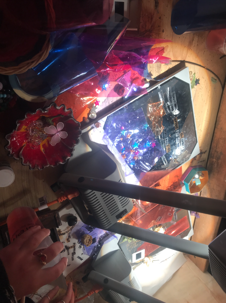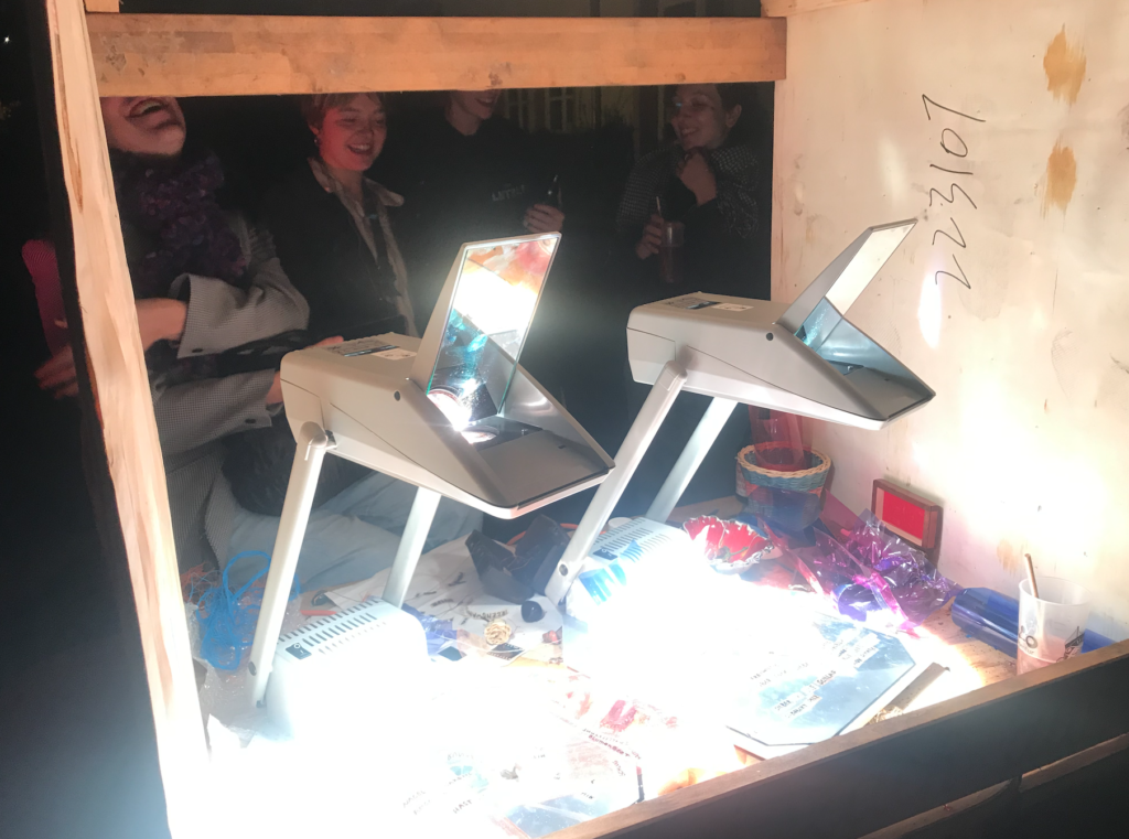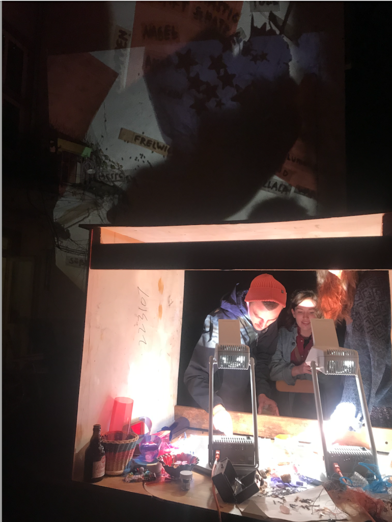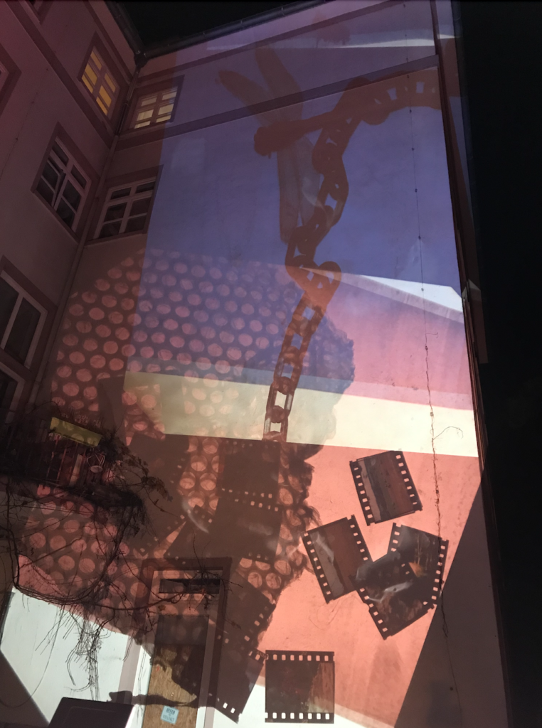 Polylux-Xulylop was developed in collaboration with Katja Rehor for fun, aesthetics and collective writing at „Folk and Fusion Festival“ Hildesheim. It consists of two projectors capable of lighting up a whole house facade, rain protection and a set of words, items and foil of different colours that people can use to alter the projection and write things. Polylux is open for booking by events in the region, for further details please get in touch!